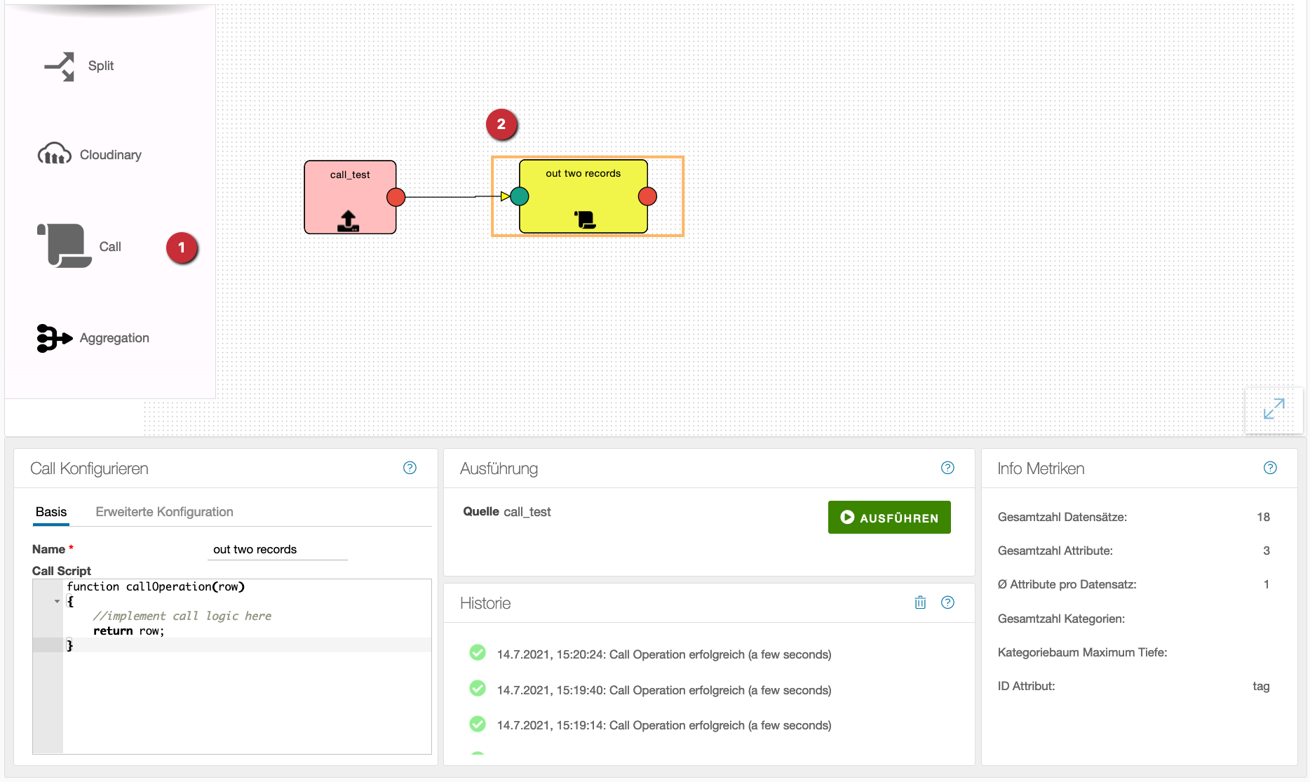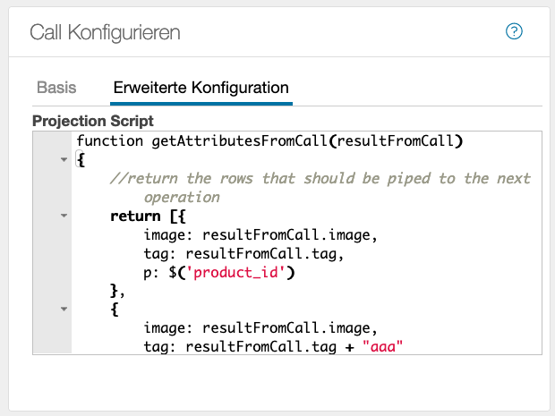 Ein Call bietet sehr variable Möglichkeiten externe Anbieter einzubinden und/oder, im Gegensatz zu einer Transformation (Felder werden 1:1 umgesetzt), Tabellen beliebig umzubauen. Beispielsweise ist es möglich eine ProduktID bei einem externen Anbieter abzufragen und die erhaltenen Produktdaten in die Tabelle einzufügen. Ein anderes Beispiel: Eine Tabellenzeile soll auf mehrere Zeilen aufgeteilt werden. Auch hier lassen sich die Daten beliebig ergänzen, umbauen oder entfernen. Zum Verarbeiten werden Funktionen in JavaScript Syntax verwendet. Damit sind sehr komplexe Aufrufe möglich.