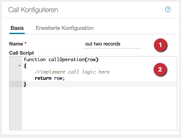 - Im ‘Call Script’ wird eine Aktion für bzw. mit den Daten festgelegt, in diesem Beispiel werden die Daten einfach an die ‘erweiterte Konfiguration’ durchgereicht.