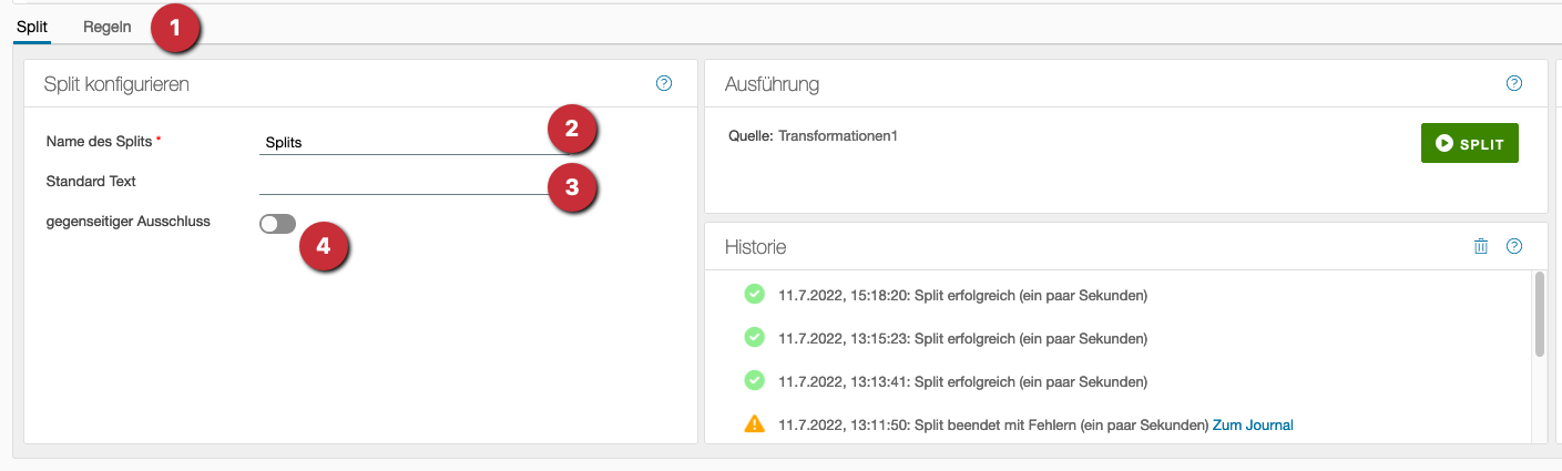 Reiter Split/Regeln- Wechsel zwischen Grundeinstellungen und Split-Regeln. -