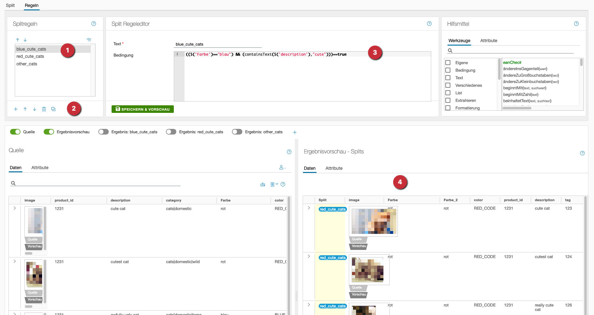 Für jede erstellte Regel wird ein Split-Ausgang erstellt. Die daraus gezogenen Daten können anschließend in ein Datenziel exportiert oder weiter manipuliert werden.