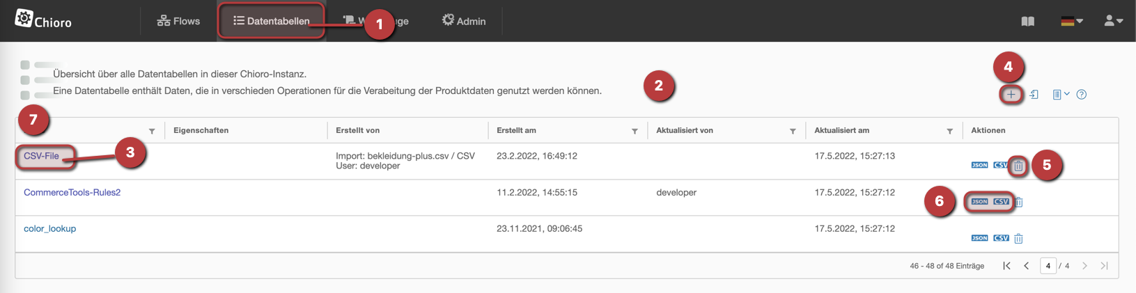 Inzwischen sollte klar sein, dass die in Chioro verarbeiteten Daten kurzlebig sind. Die Ergebnisse werden vorübergehend gespeichert, um Analyse und interaktive Arbeit zu ermöglichen. Es kann jedoch nicht garantiert werden, dass sie für immer erhalten bleiben. In bestimmten Fällen kann es nützlich sein, persistente Tabellendaten zu haben, die in Chioro verwendet werden können. Das ist die Hauptfunktionalität von Datentabellen. Im Gegensatz zu den anderen Daten in Chioro sind Datentabellen ein dauerhafter Mechanismus zum globalen Speichern bestimmter Datentypen.
